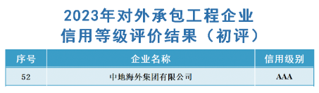 根據(jù)《中國(guó)對(duì)外承包工程商會(huì)企業(yè)信用等級(jí)評(píng)價(jià)管理辦法》,經(jīng)過專業(yè)機(jī)構(gòu)評(píng)價(jià)、評(píng)審委員會(huì)審議、網(wǎng)上公示等程序,中地海外公司獲評(píng)“2023年度對(duì)外承包工程信用等級(jí)AAA級(jí)企業(yè)”(最高級(jí)),這是公司連續(xù)第16年獲此殊榮。