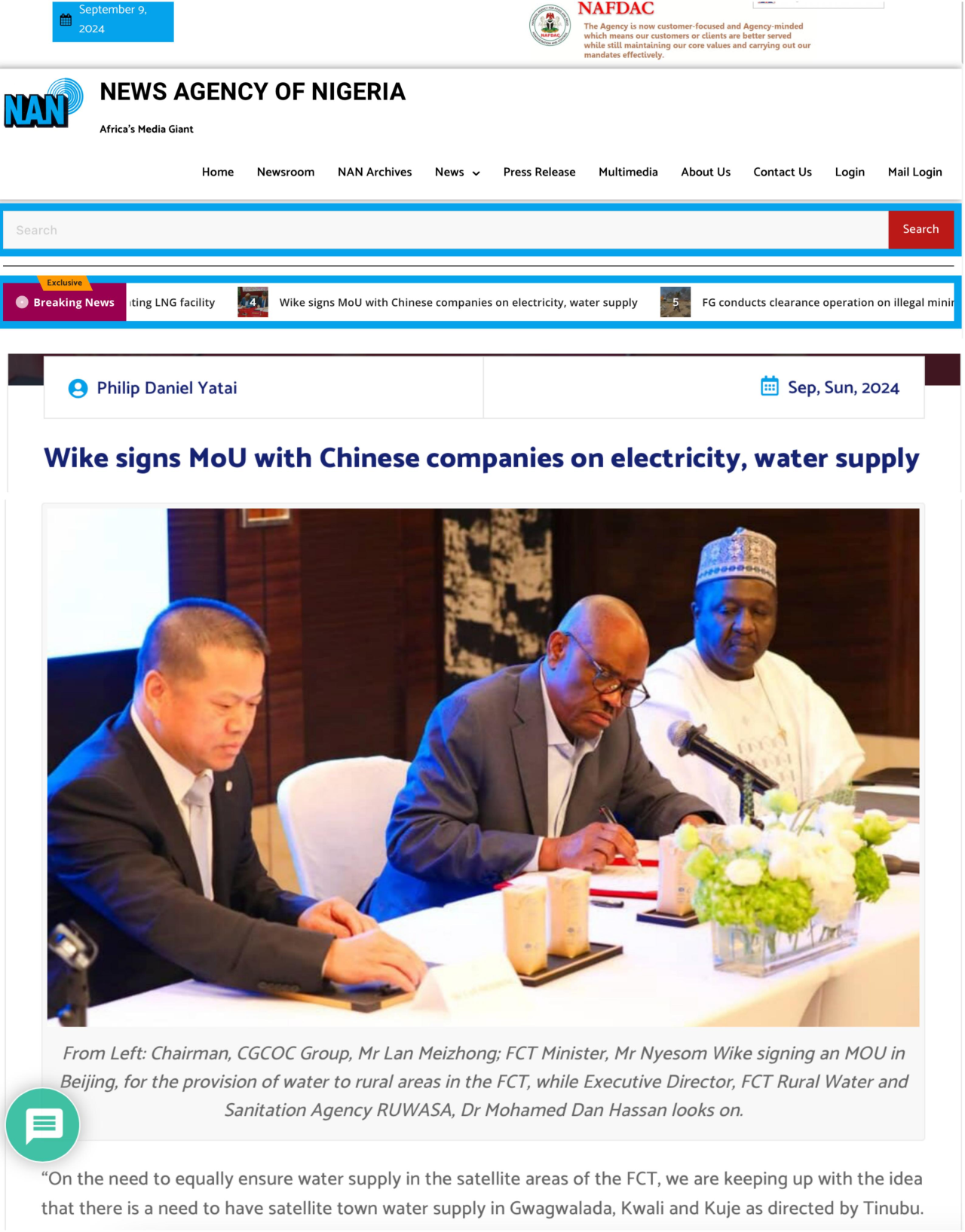 9月8日,尼日利亞通訊社等多家尼主流媒體就尼聯(lián)邦首都區(qū)部長維克與中地海外簽署的關(guān)于首都阿布賈區(qū)太陽能路燈改造、衛(wèi)星城鎮(zhèn)供水等地區(qū)的電力和供水項(xiàng)目合作備忘錄進(jìn)行了報(bào)道。