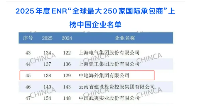 當(dāng)?shù)貢r間8月21日,美國《工程新聞紀錄(ENR)》發(fā)布2025年“全球最大250家國際承包商”榜單。中地海外集團有限公司連續(xù)20年入圍榜單,2025年排名第138位。