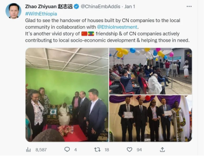中國駐埃塞俄比亞大使趙志遠在twitter上發(fā)表相關(guān)內(nèi)容,向中國企業(yè)對當(dāng)?shù)厣鐣龀龅呢暙I表示贊賞。