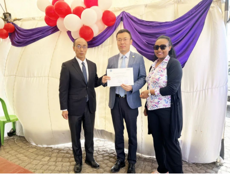 楊依杭公參(左一)與埃塞投資委員會主席Lelise Neme 女士(右一)為中資企業(yè)頒發(fā)感謝證書,中地海外副總經(jīng)理高磊(左二)代表公司領(lǐng)獎。