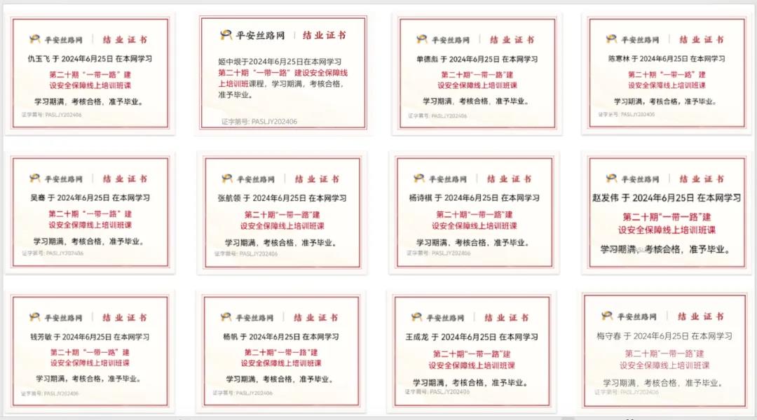 線上安保培訓,提升安保體系建設能力。6月份,公司結合“平安絲路網(wǎng)”線上課件,對駐外員工進行安全培訓,主要涉及境外安全體系建設、境外安全形勢、突發(fā)事件的應急與處置、收集恐襲信息方式與渠道等多個方面內(nèi)容。各職能部門、事業(yè)部和多個項目的15名安全工作相關人員順利完成培訓并取得了結業(yè)證書。
